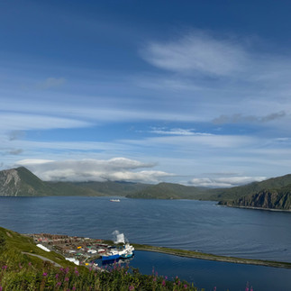 The view was gorgeous for a 360 degree peek of the town and surrounding bays. Fishing processing plant is just across from Captains Bay. During peak season, over 1,000 temporary workers come here. Dutch Harbor is the largest fish exporter by volume. White fish is the now main harvest while red king crabs used to be the top.