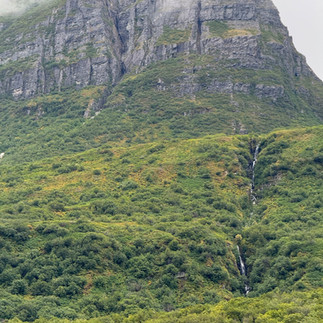 It seems that we were all in a beautiful piece of ink painting. Rock walls rise dramatically from the fjords. Thick rainforest grows on nearly vertical slopes from sea level to mountaintops. Numerous waterfalls plunge from above. Our zodiac approached one of the waterfalls, and we all enjoyed the extra love from the mother nature.